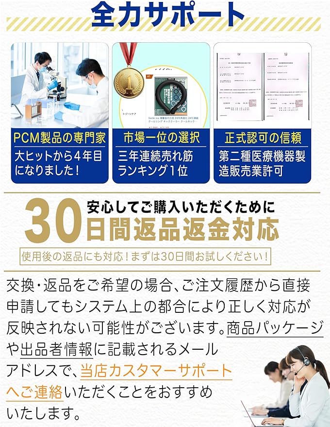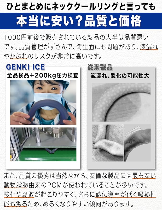 【徹底した品質管理&無償交換対応】Genki Iceのクールネックリングは、ISO9001認証の工場と日仏デザイナーによる共同開発でさらに進化。お客様の声を元に細部まで改善を重ね、出荷前に全品検品・液漏れがあれば無償で交換対応。私たちは、お客様の声にもっとも寄り添う限定商品を目指しています。