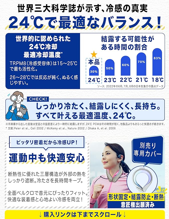 【2025年モデル・5つの進化ポイント】今年のモデルは、使いやすさとデザイン性が大幅アップ!PCMを約70%増量(S/M/L) → 冷却力2.5倍;新登場XSサイズ → 小さなお子様も快適に装着;タグを小型化 → 髪が絡みにくく快適;トレンド感ある新色5色 → フランスデザイナーとのコラボ;専用保冷バッグ付き → スマホや財布も入る多機能タイプ。耐久性・断熱性◎
