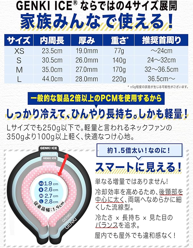 【サイズと重さの目安】ぴったりのサイズ選びで、より快適な冷感体験を:Lサイズ(約238g):首回り35cm以上の方におすすめ;Mサイズ(約185g):首回り32〜34cmにおすすめ;Sサイズ(約155g):首回り24〜32cmにおすすめ;XSサイズ(約73g):首回り24cm以下のお子様向け