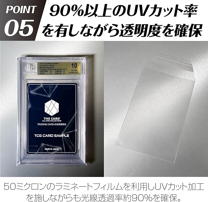 Made In Japanに拘るPSA鑑定アクセサリ専門HOTTHECARD。 大ヒットを誇るPSAスリーブは他社と一線を画すOPP/CPPのラミネート素材を採用。 独特の触り心地がコレクターの皆様から大好評を得ております。 本製品はPSAスリーブで培った技術を余すことなく利用し、BGS鑑定ケース専用として製造技術を落とし込んで作成したスリーブです。TCGサイズ専用となりますので、スポーツカードの中でもメモラビリアカードのような厚み1cmを超えるカードは対応しません。最新の試験結果によるフィルムのUVカット率は非常に高いものとなっており、UV-A,UV-Bともに90%以上のカット率を叩き出しました。(商品画像参照)インクや紙の劣化を引き起こす波長帯のメインである320-360nmまでは従来のフィルムをさらに上回る結果となり、また320nm以下では100%に近い高いカット率となります。 THECARD史上最強のフィルムです。このようなカット率が高いフィルムは今までも存在しておりますが、透明度や色味に問題がありました。今回その点について研究を重ね、コレクターの皆様の需要に耐えうる透過率約90%のレベルまで引き上げ色味も黄ばんだようなことも無く白です。是非お手に取ってみてください。