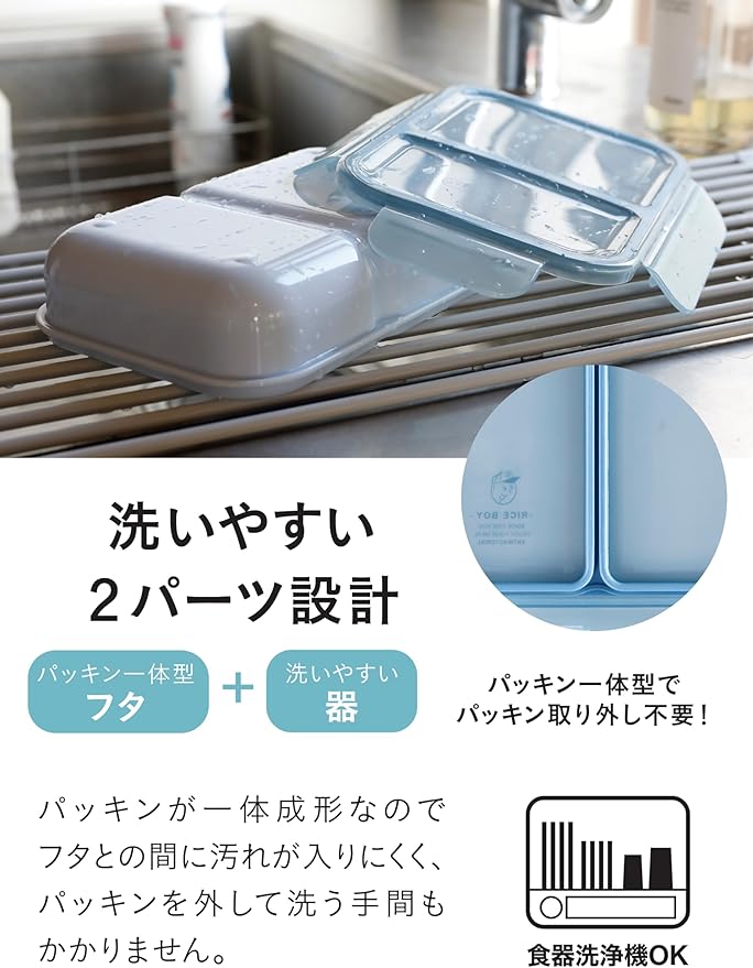 「パッキン一体型のフタ」と「本体容器」の2パーツなのでお手入れも楽々。食器洗浄器対応なので、日常使いにも最適です。※食器洗浄器で使用する際は、蒸気・熱風・熱湯の吹き出し口の側に置かないで下さい。変形や破損の原因になります。