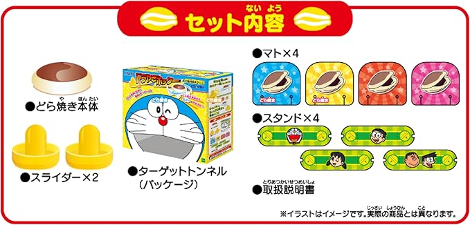どら焼き本体、スライダー 2、ターゲットトンネル(パッケージ)、マト 4、スタンド 4、取扱説明書
