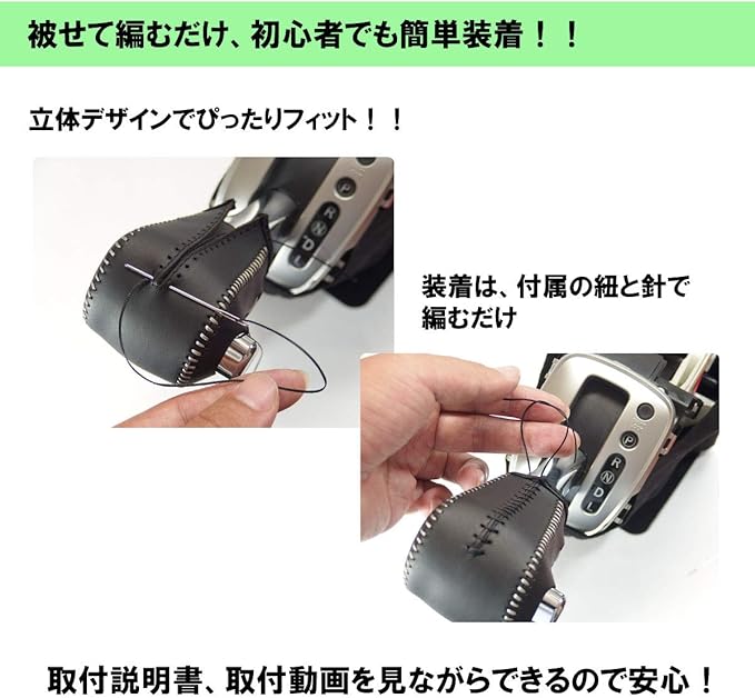 装着は簡単! 付属の紐と針で靴ひもを編むように締上げるだけ! シフトノブを外す必要もありません。