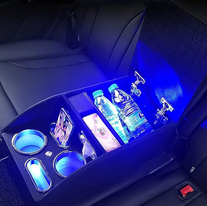 【高級感】リアシートのセンターに置くだけで高級セダンのような快適性をプラス。上質なPVCレザーはアームレストとして快適にご利用いただけます。PVCレザーとLED照明、艶のあるブラックABS樹脂とシルバーメッキの相乗効果で内装のグレード感がアップし、ラグジュアリーな車内空間を演出します。