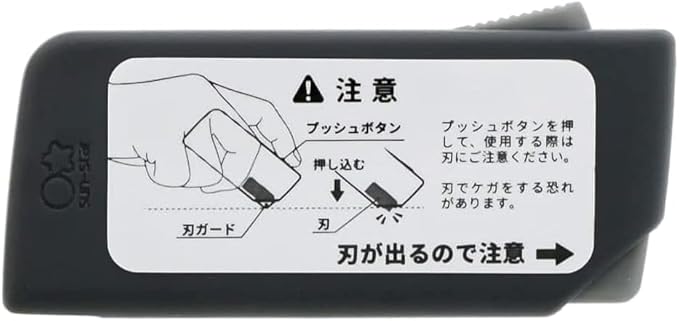開梱カッターのポイント 1プッシュボタンを押すことでロック解除! 2ブレードガードをダンボールなどに押し込むとカードがスライドし刃が出る! 3使用後はプッシュボタンを放すとロックが掛かり安心! レターオープナーのポイント 1差し込んでスライドするだけで、手紙や封筒がラクラク開封! 2刃がオモテに出ていないので安心!
