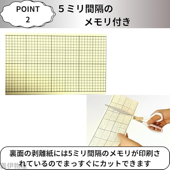 【5ミリ間隔のメモリ付き】裏面の剥離紙には5ミリ間隔のメモリが印刷されているのでどなたでもまっすぐにカットすることができます。