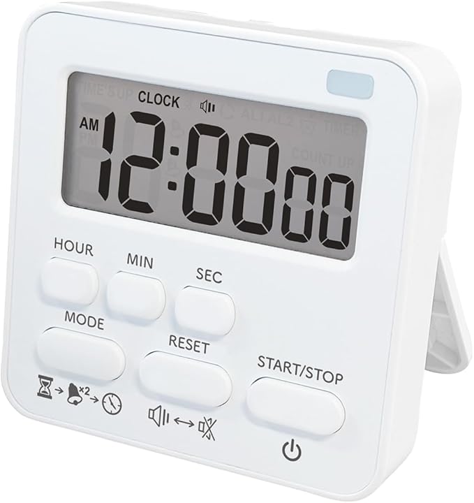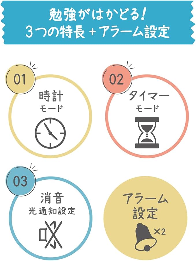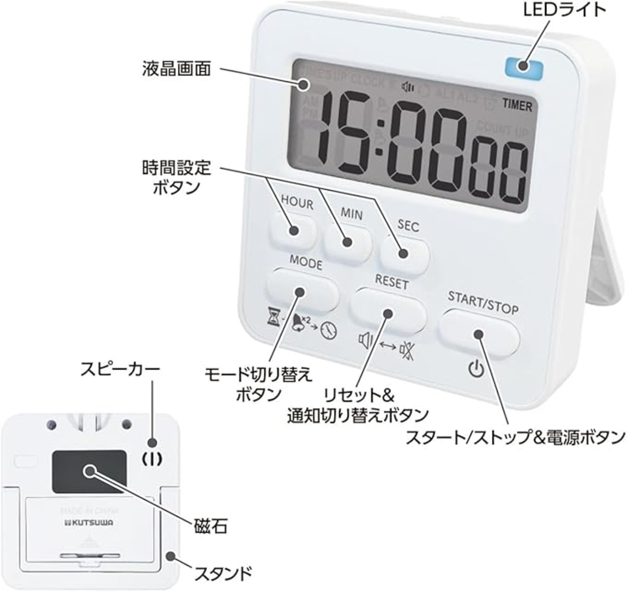 ・時計モード(AM・PM表示)、タイマーモード(カウントアップ・カウントダウン)の機能付き