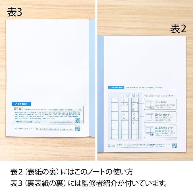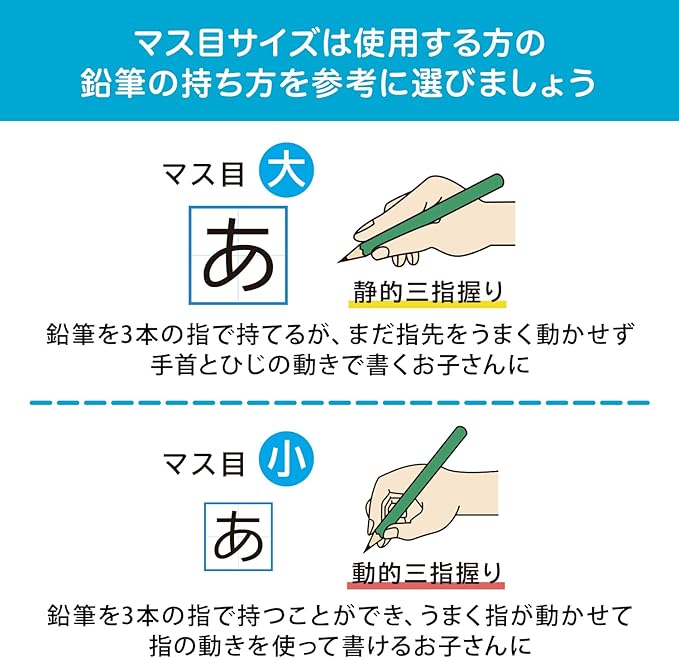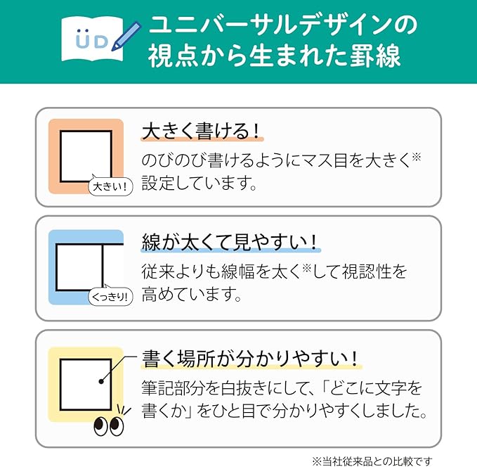 従来の学習帳よりも大きく書けるように設計しており、筆記部分が白抜きで罫線が通常よりも太いので、どこに文字を書けばよいかが一目で分かるのが特長です。