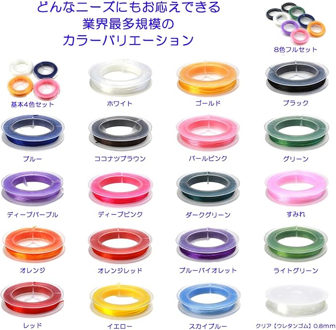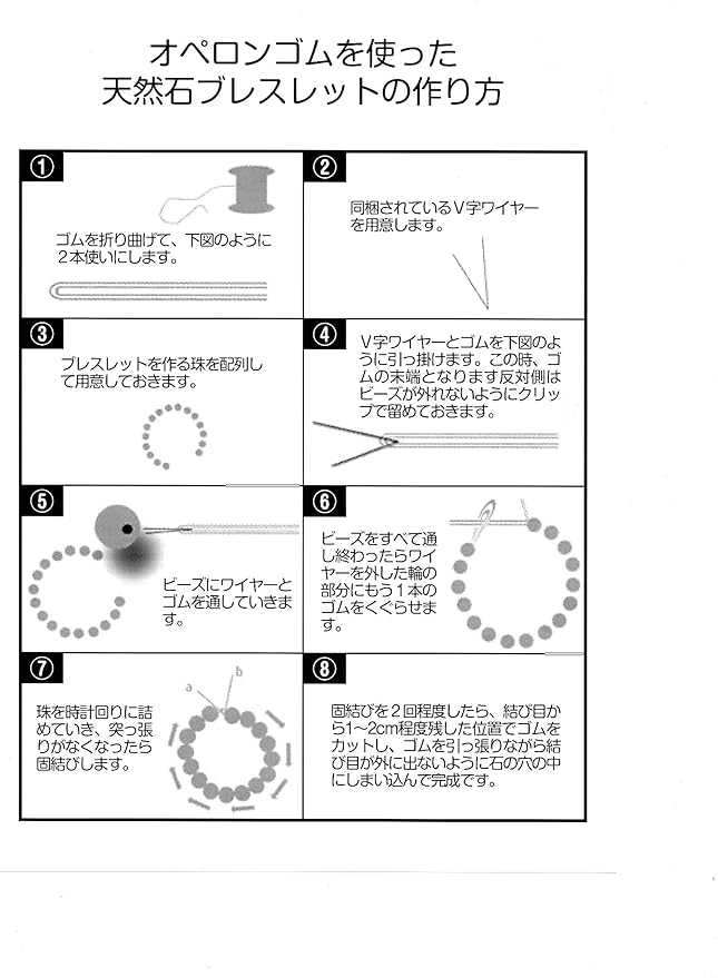 【天然石をより美しく見せます。】ビーズの色と同色系のゴムを使用することで、透明感のある素材は色合いが見違えるように鮮やかになります。 オペロンゴム1巻、10mを2重使いで約15~18本程度のブレスレットが作成できます。 1巻当りで作成できる本数は使い方により変わります。 初めて作成や修理をされる方も解説書付ですので安心です。