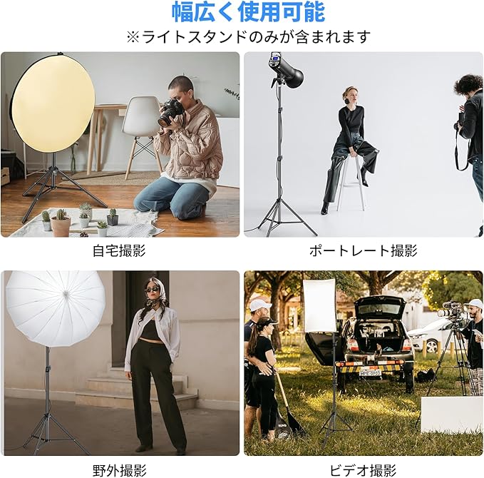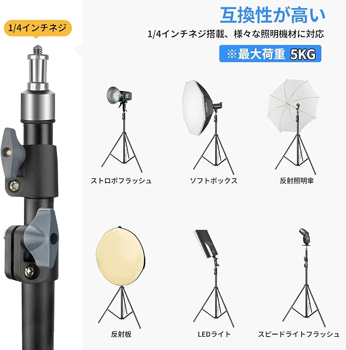 【幅広くアプリケーション】照明スタンドの先端に1/4ネジ付き、モノブロックストロボ、ソフトボックス、反射傘やレフ板などに対応し、スタジオキットとして写真撮影やビデオ撮影などに最適です。 耐荷重:約4kgまで