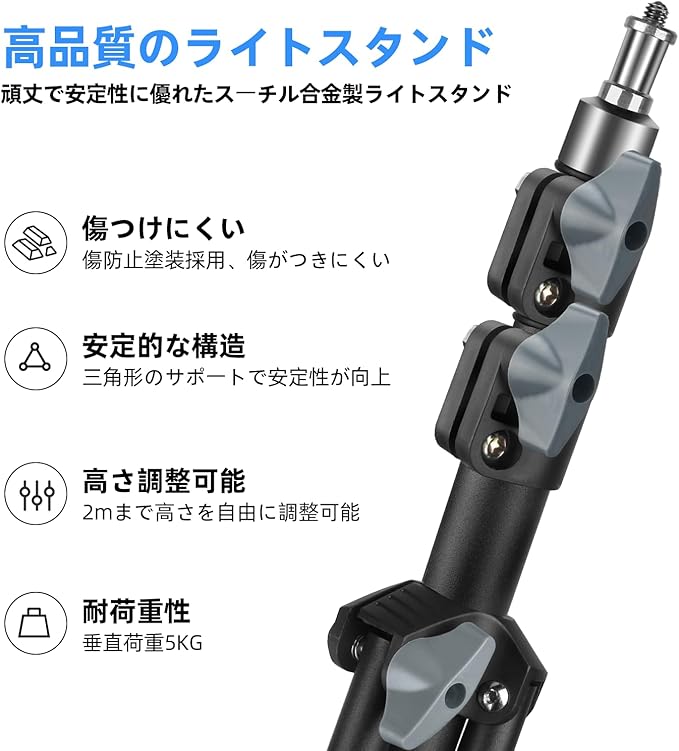 【高質感・高さ調整自由】ライトスタンドの表面はマットでざらつきのある特殊強化加工が施されており、擦り傷がつきにくく、手触りが心地よいです。撮影スタンドは三段階で高さを85㎝から2mまで調整可能です。 収納高さ:約71㎝