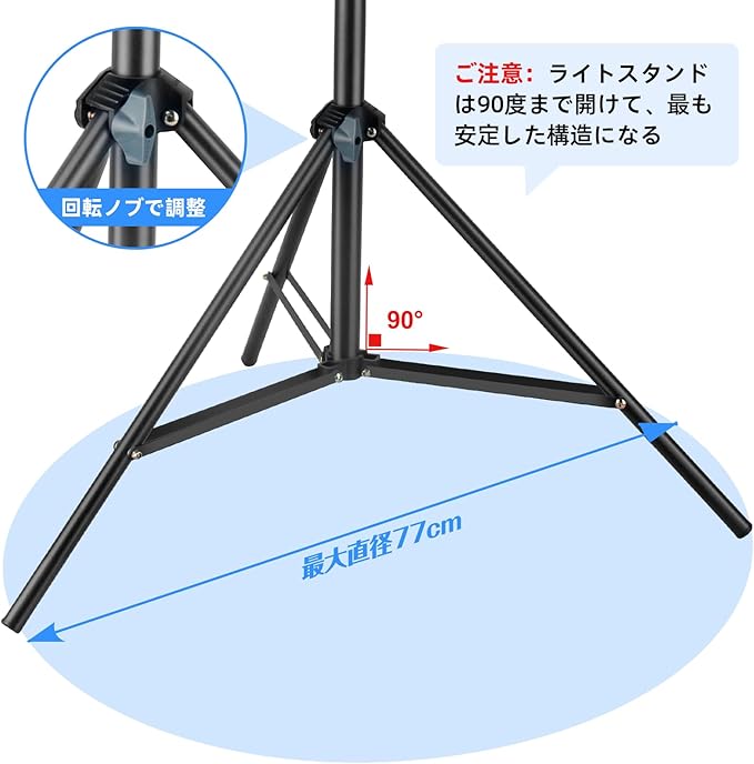 【洗練されたデザイン】固定用のツマミは強化ノブを使用し、握りやすく、細かな調整もにできる手にや優しい設計です。三脚を開いて置いた設置面積はは77cm広いほど安定性が良いです。パッケージ重量:約2.15㎏