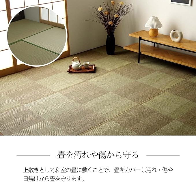 い草カーペットは和室の畳をカバーし、汚れや傷を防止してくれます。通常のカーペットと違い毛足が無いのでゴミや髪の毛などがからみにくく、掃除機やコロコロ(粘着シート)での掃除がラクにできます。い草には優れた消臭機能があり、汗臭やペット臭などの原因となる物質を消臭してくれます。い草には喘息の原因の一つとも言われる二酸化窒素や、シックハウス症候群の原因の一つのホルムアルデヒドを吸着してくれます。天然物質としては抗菌力の高い青森ヒバから抽出したヒノキチオールをい草生地に使用しており、抗菌防臭効果があります。い草の癒される香りとサラッとした肌触りはそのままに、和室や洋室にも合わせられるインテリア性の高いナチュラルシンプルなデザインで仕上げています。