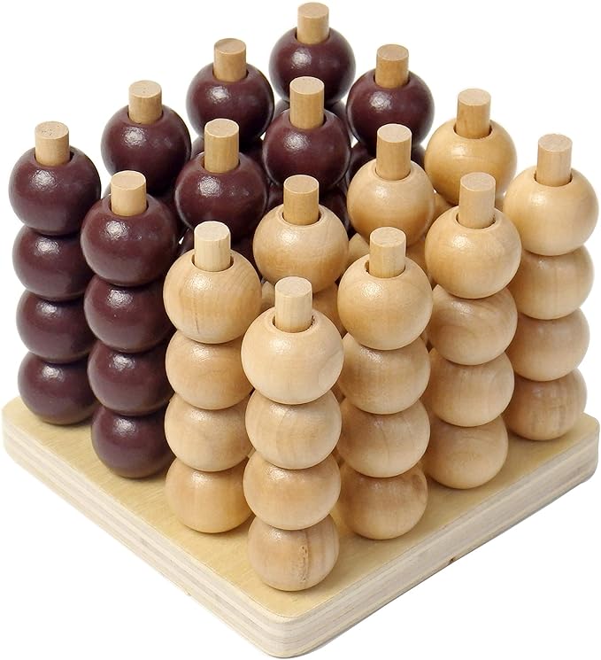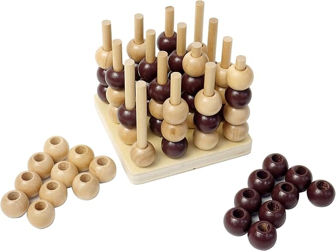 大人でも子供でも楽しめる木製の立体4目並べです。タテ・ヨコ・ナナメにそろった方が勝者となります。 4 4 4の立体場の枠内で4個の玉を先に一直線に並べることを競う遊び! 同様にコマを直線に並べることを競う連珠や五目並べなどとの相違点は、玉を配置する空間が2次元ではなく3次元である点にあります。 四目並べを行なう盤面には、格子状に並べられた棒が垂直に立っていて、色の違う2種類の玉の中央に穴を開けたものを使用し、2人のプレイヤーが交互に自分の色の玉をこれらの棒のどこかに入れます。 平面方向には任意の場所を選ぶことができますが、垂直方向に対しては重力の関係で先に玉が入っているものの上(または盤面のすぐ上)にしか玉を置けないという点がこのゲームのキーポイント! プレイヤーは交互に玉を入れていき、自分の色の玉を縦横斜めいずれかに4つ並べることを目指します。 サイズ(組立時):タテ10 ヨコ10 高さ8.7cm 組立式 ※収納用の箱・袋等は付属しておりませんのでご了承ください。 ※使い切りの木工用ボンドを同封しておりますので、盤面に棒を挿した際に緩みが気になるようでしたらご使用ください。