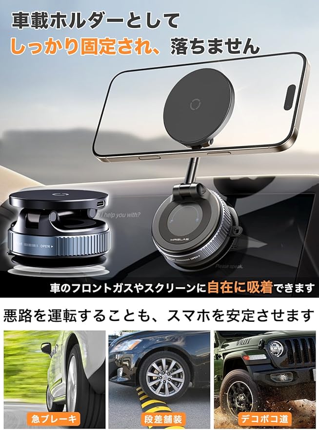 ✅【強力なMagSafe固定機能】スマートフォンの固定はMag-Safeマグネットで行い、付属のメタルプレートを使用することで、非Mag-Safe対応の機種でも利用可能です。用途や設置場所に応じて、Mag-Safeマグネットによる固定と真空吸着を使い分けることができます。