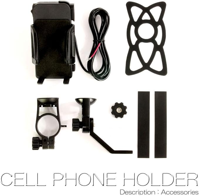 【セット内容】 ■本体(電源配線約1.6m)x1 ■ハンドルクランプx1 ■ハンドルクランプ用厚さ調整シート2 ■ミラーホルダー固定ステーx1 ■脱落防止ラバーグリップx1