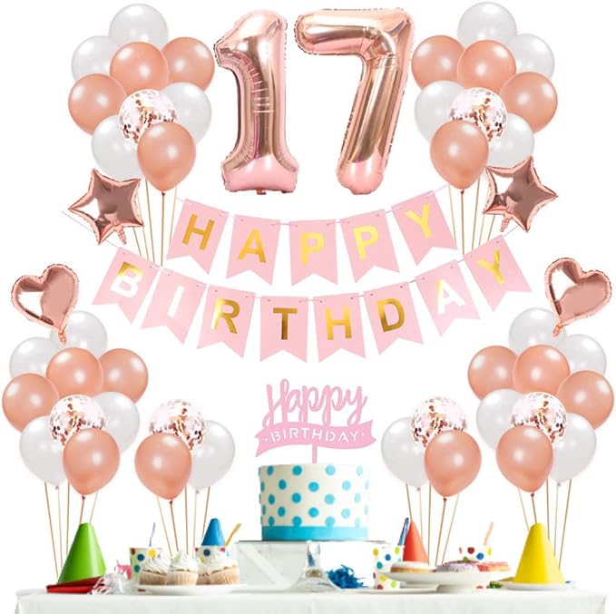 【セット内容】①「17」バルーン ②「HAPPY BIRTHDAY」ホイルバナー ③ハート風船 4 ④星風船 4 ⑤シルバー風船 12 ⑥ブルー風船 12 ⑦紙吹雪風船 12 ⑧ 空気ポンプ 1、ドット状両面テープ 2、銀色リボン 2