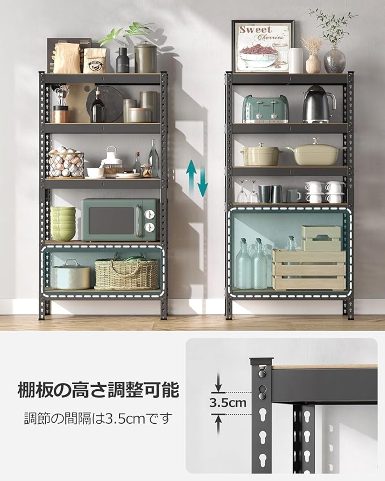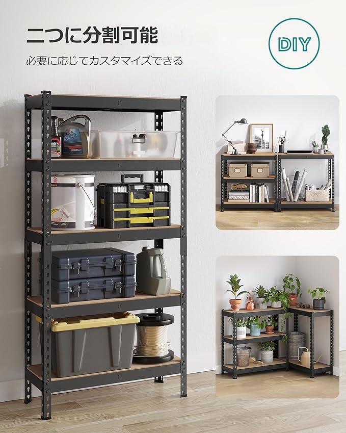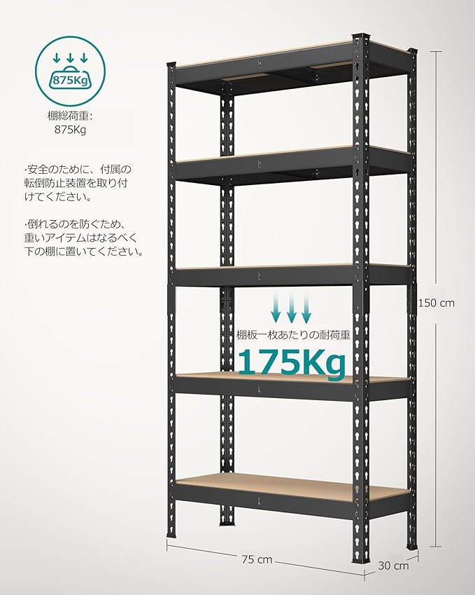 【抜群の耐久性と収納力】棚板1枚当たり約175kgの耐久性があり重い物を乗せても耐えられます。総耐荷重は875KGです。