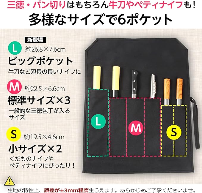 【6本収納・工夫の設計】6つの包丁ポケットあり、大小様々な包丁を手軽に収納可能です。主に牛刀包丁・菜切包丁・ペティナイフ・刺身包丁で考慮致したポケットタイプです。小さなサイズのポケットもありペティナイフ等も収納しやすいです。布巻きができやすいよう他社製品よりもポケットの幅に数ミリの厚みを持たせる工夫も行っており、商品は日々改善しております。