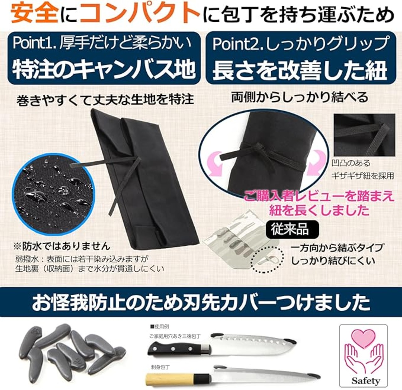ピーアンドシー 包丁ケース 布巻き 刃先カバー付き 6本収納 深長いポケット 持ち運び 27cm 帆布 キャンプ アウトドア (ブラック, 6本収納)