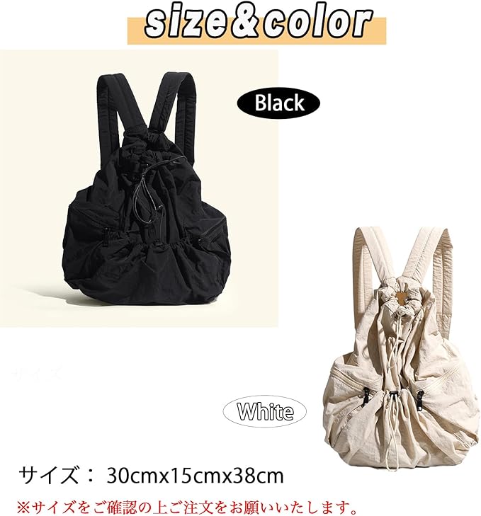 【商品仕様】 サイズ: 30x15x38cm 素材:ナイロン 重量:200g ※寸法は平置きにて計測し、多少の誤差がある場合がございます。 ※光の加減により色が多少差異がある場合がございます。予めご了承下さいませ。