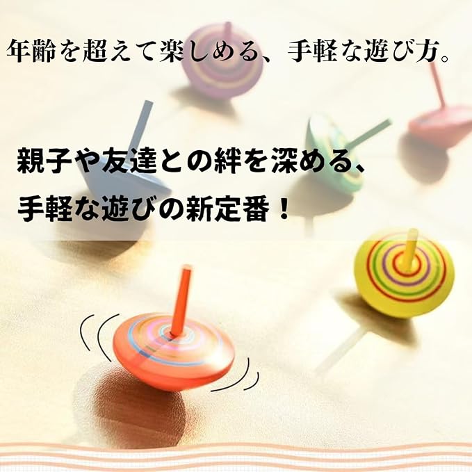 【木製の手回しコマセット】表面は滑らかで、カラフルな色合いがとても愛らしいです。コマで遊ぶことで、子供たちの注意を引きつけ、集中力を高めることができます。