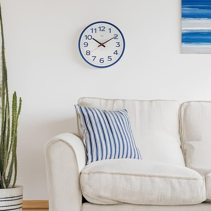 海をイメージした爽やかなネイビーブルーと、アクセントの赤い秒針が印象的な掛け時計。