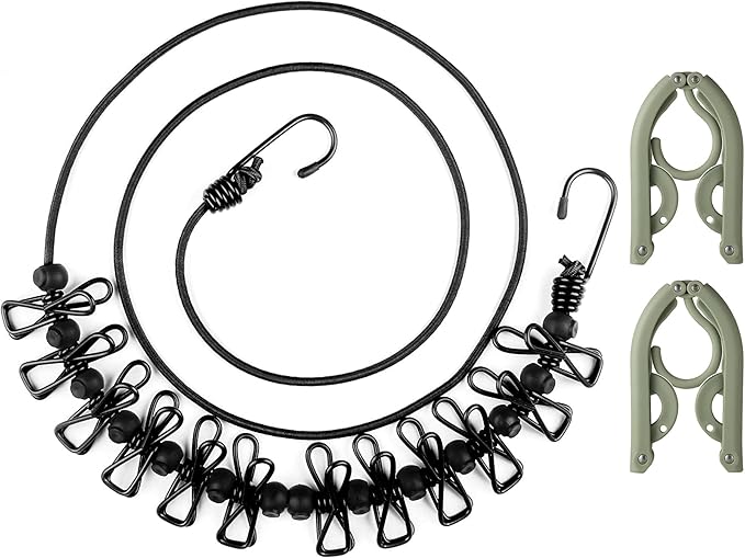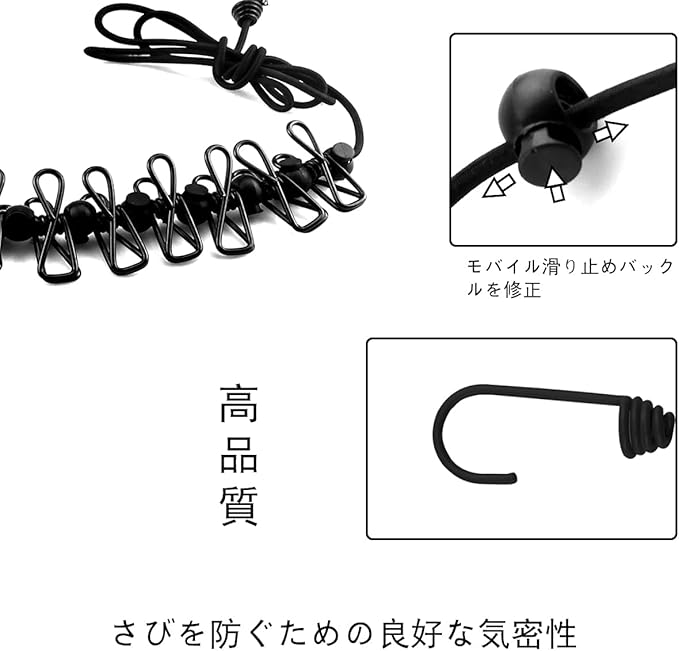 物干しロープ 弾力洗濯ロープ 12個クリップ付き 防風 伸縮 携帯便利 旅行 キャンプ 梅雨 部屋干し 伸縮物干し竿 (ブラック)