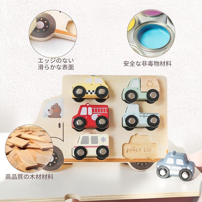 [木製車モデル]木製の車のパズルモデルのセット。かわいいデザイン、コンパクトカー、木材素材。小さな赤ちゃんの手でさえ、車のサイズは簡単に保持でき、プレイは楽しくなります。