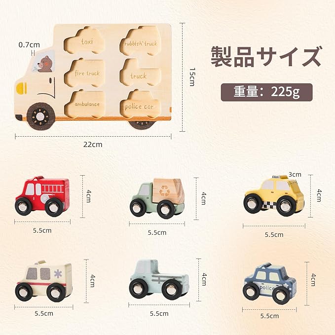 [製品]パズルピースと6台の車があります。パズルのサイズは15cm*22cmです。車のサイズは5.5*4cmです。製品の重量は225gです。