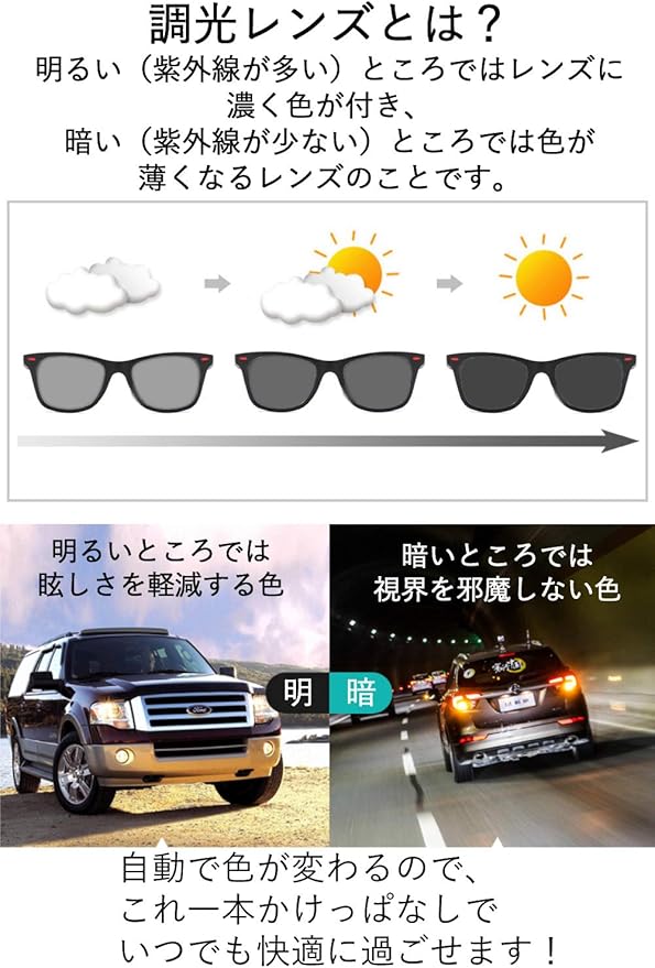 話題の調光偏光レンズを採用したサングラスです!強い日差し、路面・水面・雪面からの照り返し、対向車のライトなどの乱反射光の眩しさを軽減し、見やすいクリアな視界をキープします。