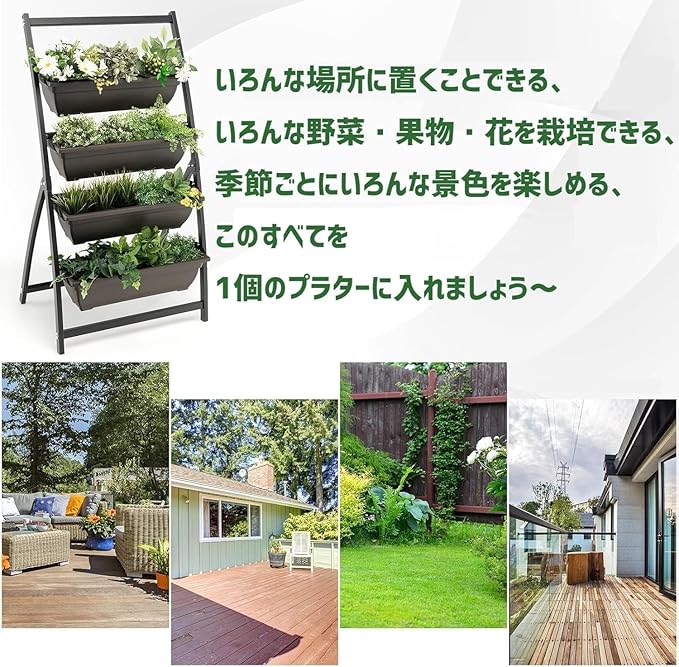 4段式で、4個のプランターが付属されていて、十分な栽培スペースが提供されます。野菜や果物、花など幅広い種類の植物を栽培することができます。