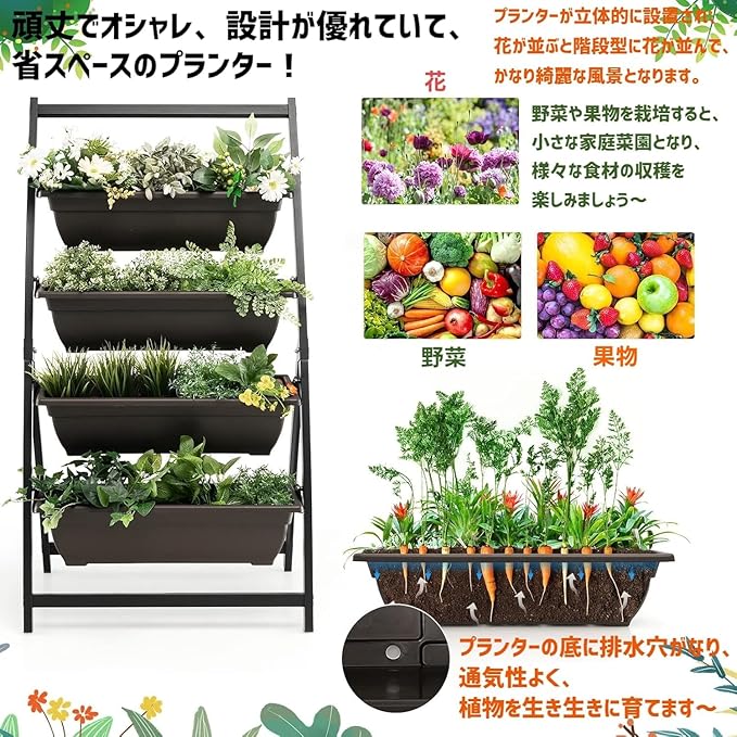 野菜や果物を栽培すると、小さな家庭菜園となり、季節ごとに様々な食材の収穫を楽しめることができます。うちの4段式のプランターを通して、自家栽培をどんどん楽しんでください!