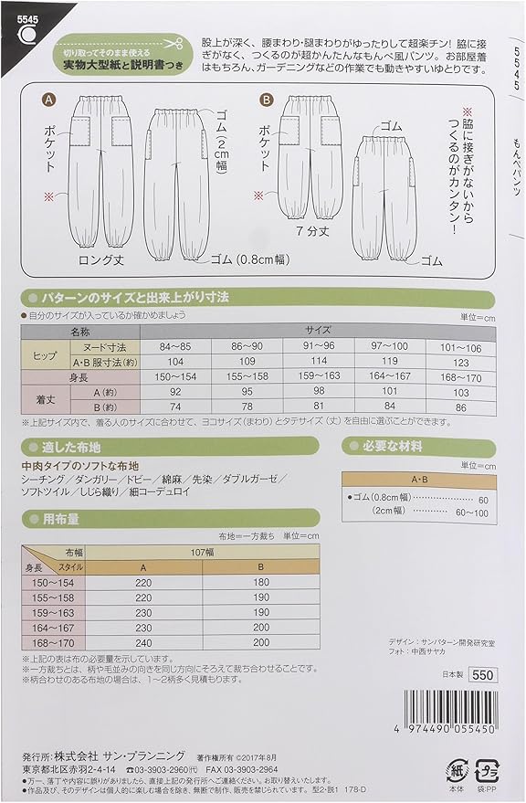 型紙・パターン フィットパターンサン もんぺパンツ 5545