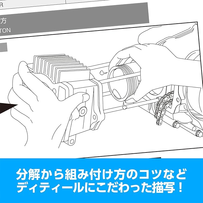 シリンダーヘッドからピストン部までの作業を記載した腰上編とクランクケースからクラッチ、ミッション、クランクシャフトまでの作業を記載した腰下編の3種類を設定。腰下編はセル付き車から遠心クラッチ車まで幅広い車種に対応しています。