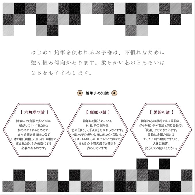 なめらかな書き味で、折れにくい鉛筆です。黒く書ける理想の芯を採用。鉛筆芯の材料である黒鉛と粘土が微粒で均一であるため、より黒く、きれいに書く事が出来ます。芯の硬さは、一般的に使用されるHBです。