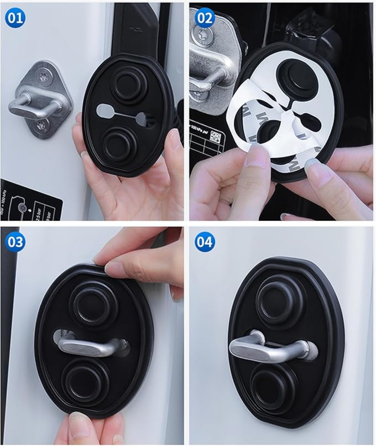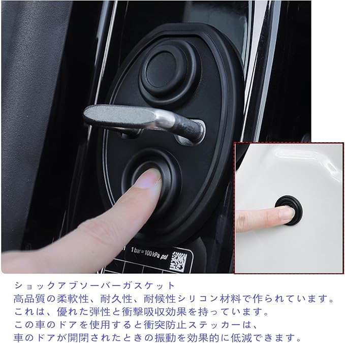 核心機能強化:ショック吸収と騒音低減を両立!高弾性シリコン素材により、ドア開閉時の振動を効果的に緩和し、衝突を防止すると同時に遮音・消音効果を発揮。ドアラッチの露出部分を保護し、雨や湿気による錆・腐食を防ぎ、車体美観を長期維持。