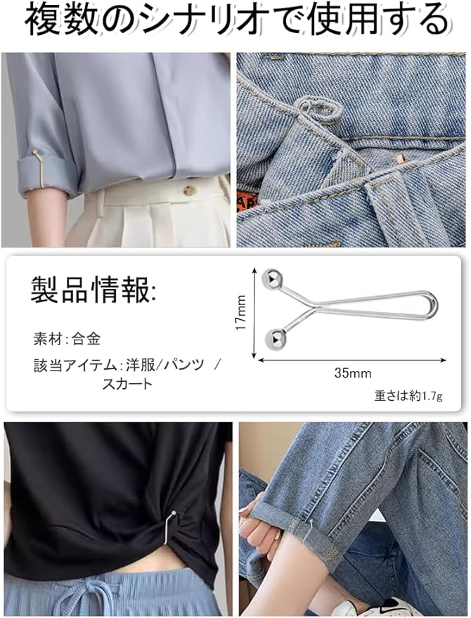 【使いやすい】ウエスト調整 このウエスト調整ボタンは、ズボンに穴を開ける必要がなく、クリップがしっかりしていて、ズボンのウエストをしっかりと固定できます。また、袖口やズボンの裾を固定してズレを防止し、理想的な位置を保つこともできます。挟むだけで簡単にウェストや裾、袖のサイズ調整可能。