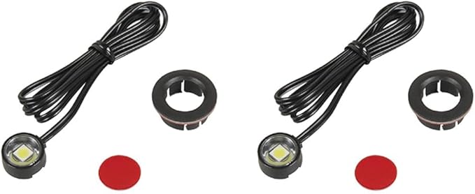 【仕様】発光色:白 (1灯) ・DC12V車専用 ・消費電流:20mA ・コードサイズ:0.2sq相当-約60cm ・LEDサイズ:Φ15 ・マウント取付穴径:Φ17 取付板厚 MAX3mm 入数:2個 ・両面テープ付属 ・専用マウント付属
