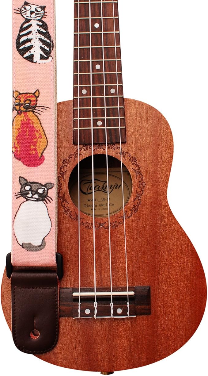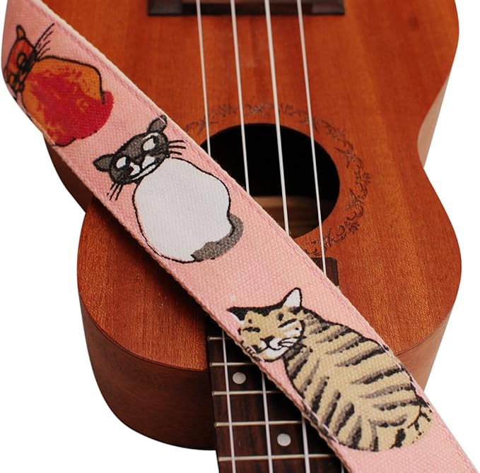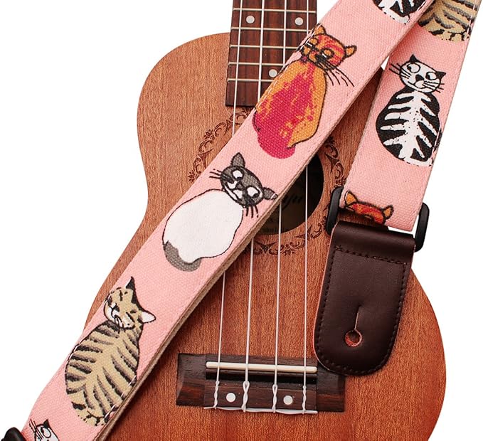 MUSIC FIRSTオリジナルデザイン「MISS CAT」ソフトコットン&本革 ウクレレストラップ/ 非常にかわいい猫模様、とても素敵。 / 素材:コットン(外側)+本革+コットン(内側)/ 幅:1.5インチ(3.8センチメートル), 長さ:48inch〜27.5inch調整可能(70〜122センチメートル)/ 一つの黄金色のストラップの爪として無料プレゼント