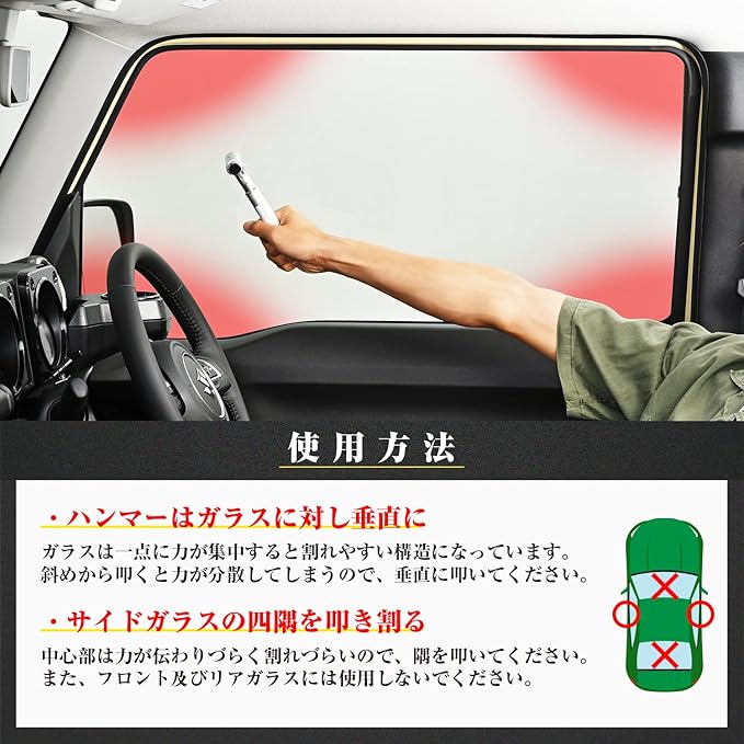 ●緊急時にドアや窓が開かない際に、サイドガラスを割って車から脱出する道具です。