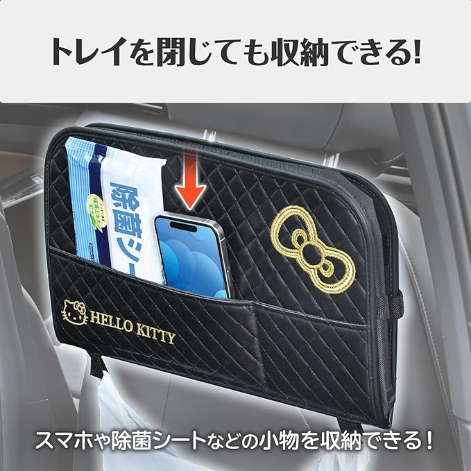 セイワ(SEIWA) カー用品 後部座席用 テーブル ハローキティ B&Gビッグリアトレイ KT560 ブラック HELLO KITTY ワイド 布生地製 多機能 フック 収納ポケット ドリンクホルダー マチ付き 閉じても使える