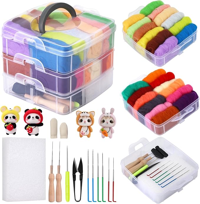 羊毛フェルト キット 初心者: フェルトニードル、握り鋏、指サック、木製ニードルホルダーなどの数十種類のツールが付いた羊毛フェルト道具なので大人まで楽しめる手芸制作基本入門キットです。練習、色の組み合わせなどなど作品の装飾などに活かせます。この1手芸フェルト セットで、すぐ手芸フェルトを始められます。可愛いフェルト作品をたくさん作れます!