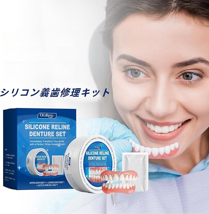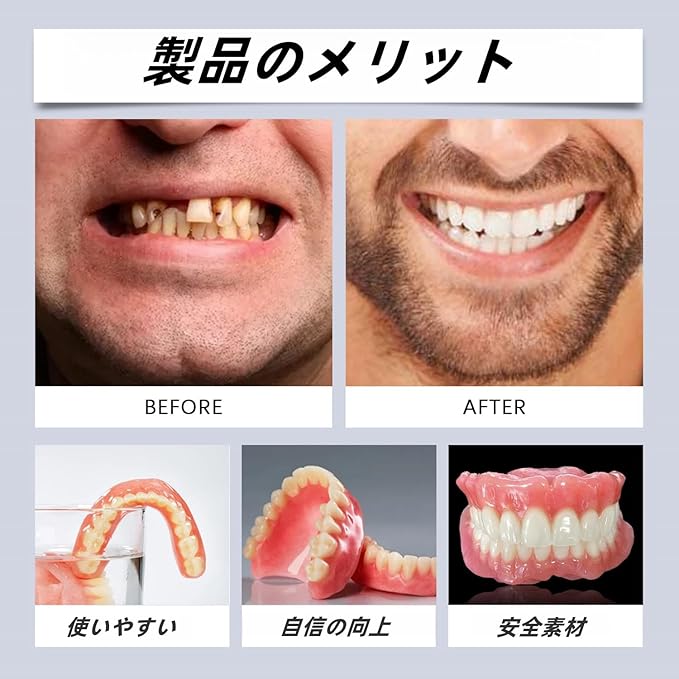 【簡単装着・着脱可能デザイン】 柔らかいシリコン素材で作られた入れ歯は、簡単に装着・取り外しが可能。使用後は専用ケースで清潔に保管でき、衛生的で便利です。上下セットで、初めての方でもすぐに使えます!