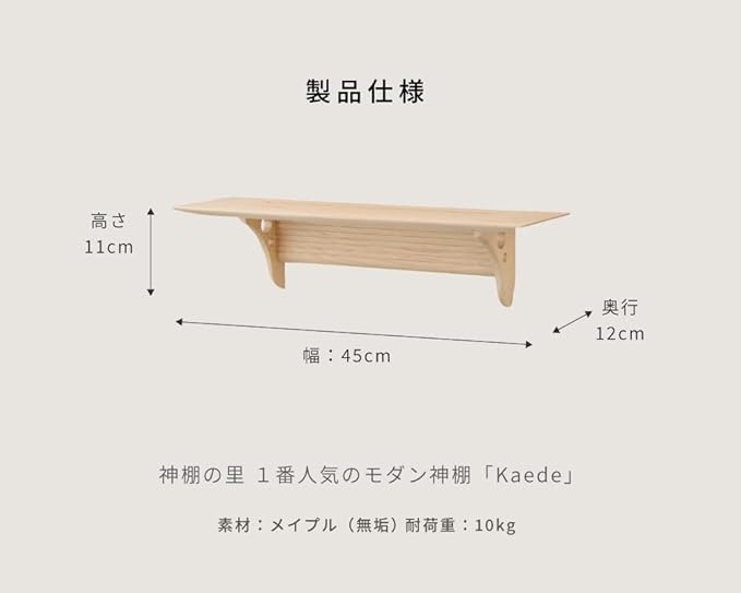 女性でも簡単に取付ができる洋風モダン神棚板の誕生です。通常の神棚板は壁への釣りつけの際にはドライバーや石膏ボード用のビスなどを用意するのが大変でした。