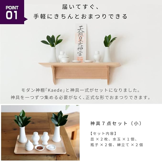 神棚をお祀りする際に必要となる、神具7点セット付き。榊立て、瓶子(お神酒)水玉(水)皿 2(米、塩