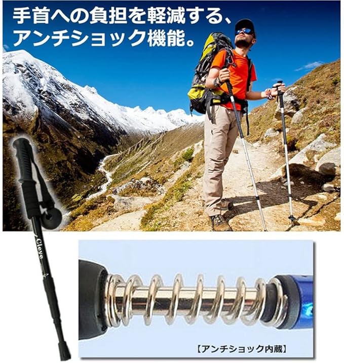 【アンチショック】スプリングが内蔵された衝撃吸収システムは肩、ヒジ、手首への衝撃を25~30%軽減してくれるので、手首の痛みを緩和してくれる働きがあります。険しい道では役立つのでハードな登山に最適です。