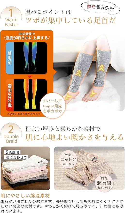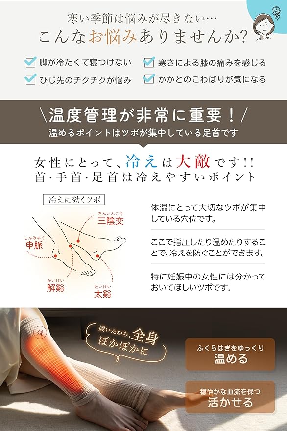【足から全身へ・足湯のように】このレッグウォーマーは、足元から全身へじんわり温かさを感じられるよう設計されています。特に足首周辺の冷感ツボをやさしく温め、まるで足湯に浸っているかのようなリラックス体験をお届けいたします。短時間の着用で足首から身体全体がぽかぽかと暖まる心地よさを、ぜひお試しください。