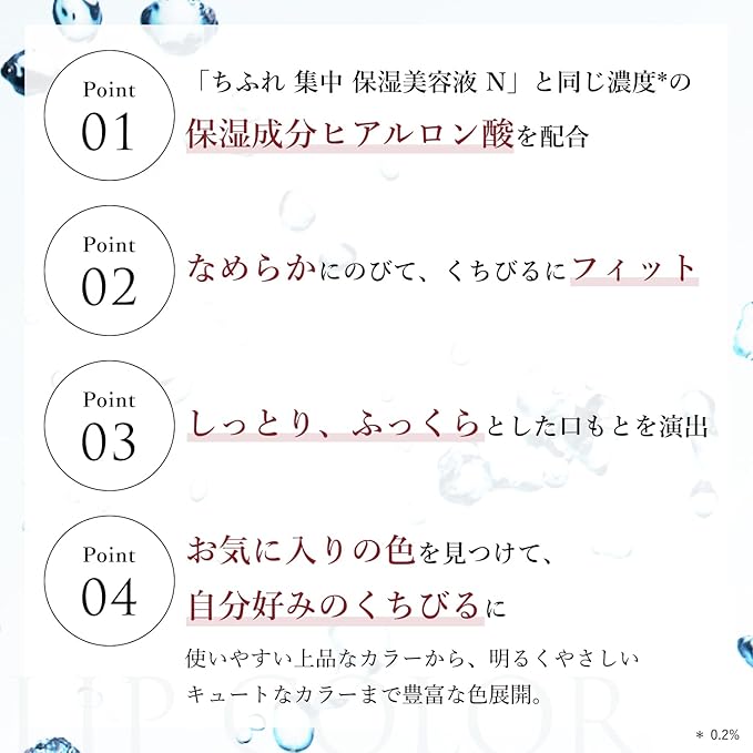 ●【美容液と同じ保湿成分配合】保湿成分ヒアルロン酸を、ちふれ集中保湿美容液Nと同じ濃度(0.2%)で配合した口紅です。