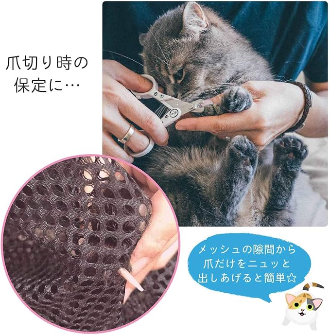 【猫の爪切りの保定にも大活躍】爪切りが苦手で暴れてしまう猫におすすめです。ネットに入ることでおちついてくれるので爪切りがしやすくなります。メッシュが大きめなので、隙間から爪だけを出して、そのままスパッと切ることもできます。